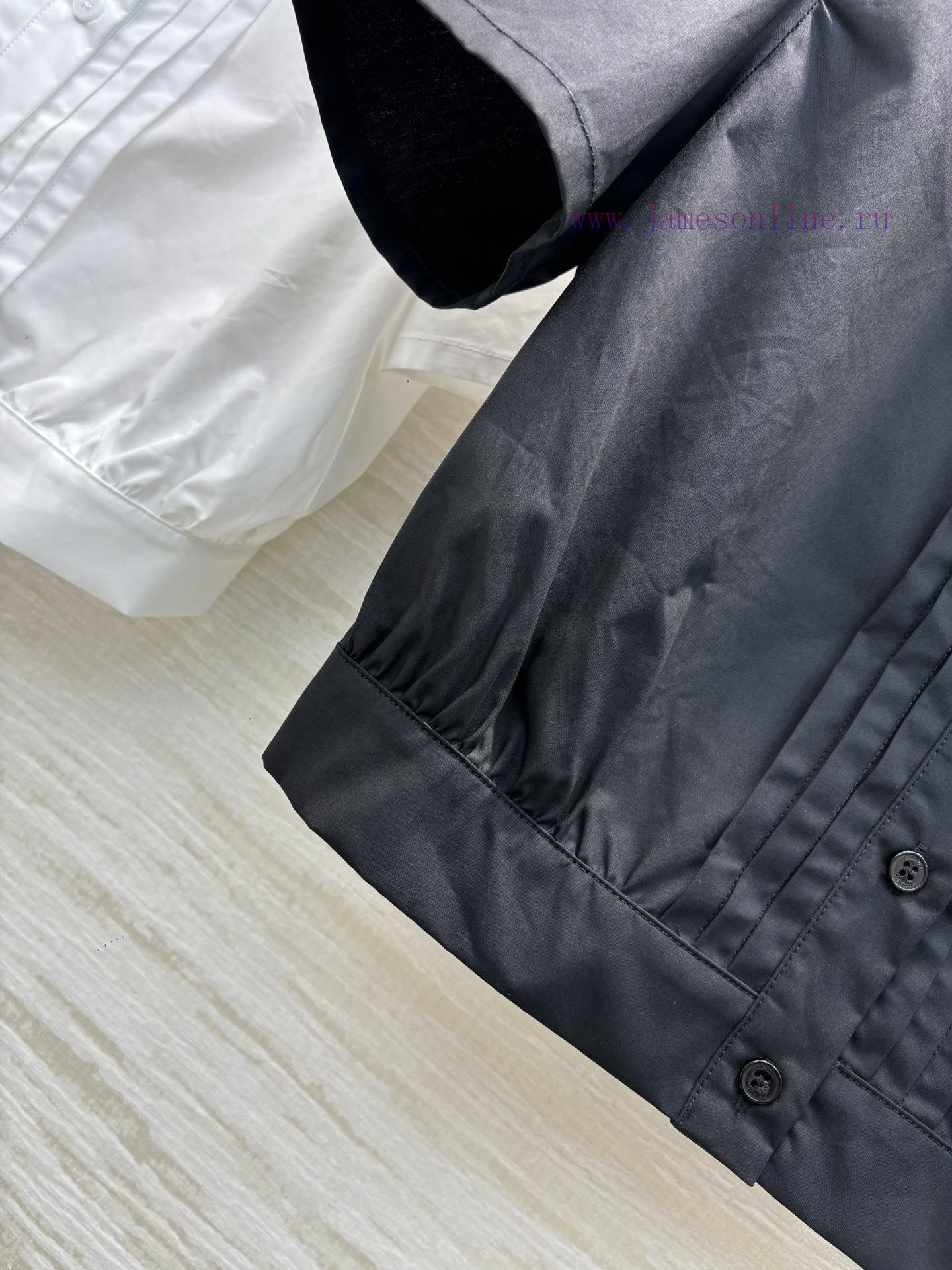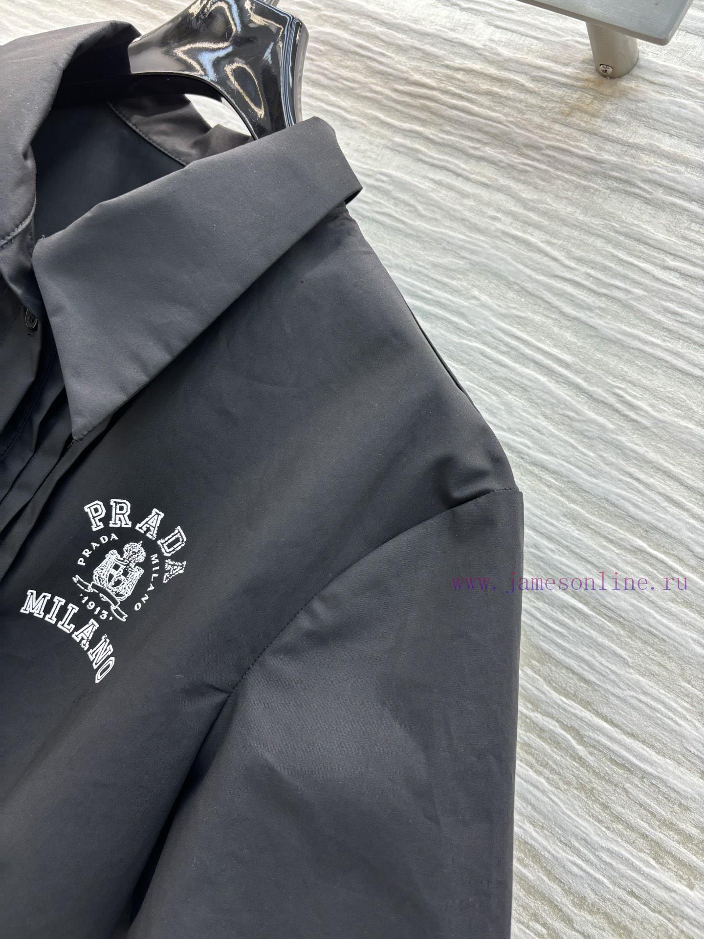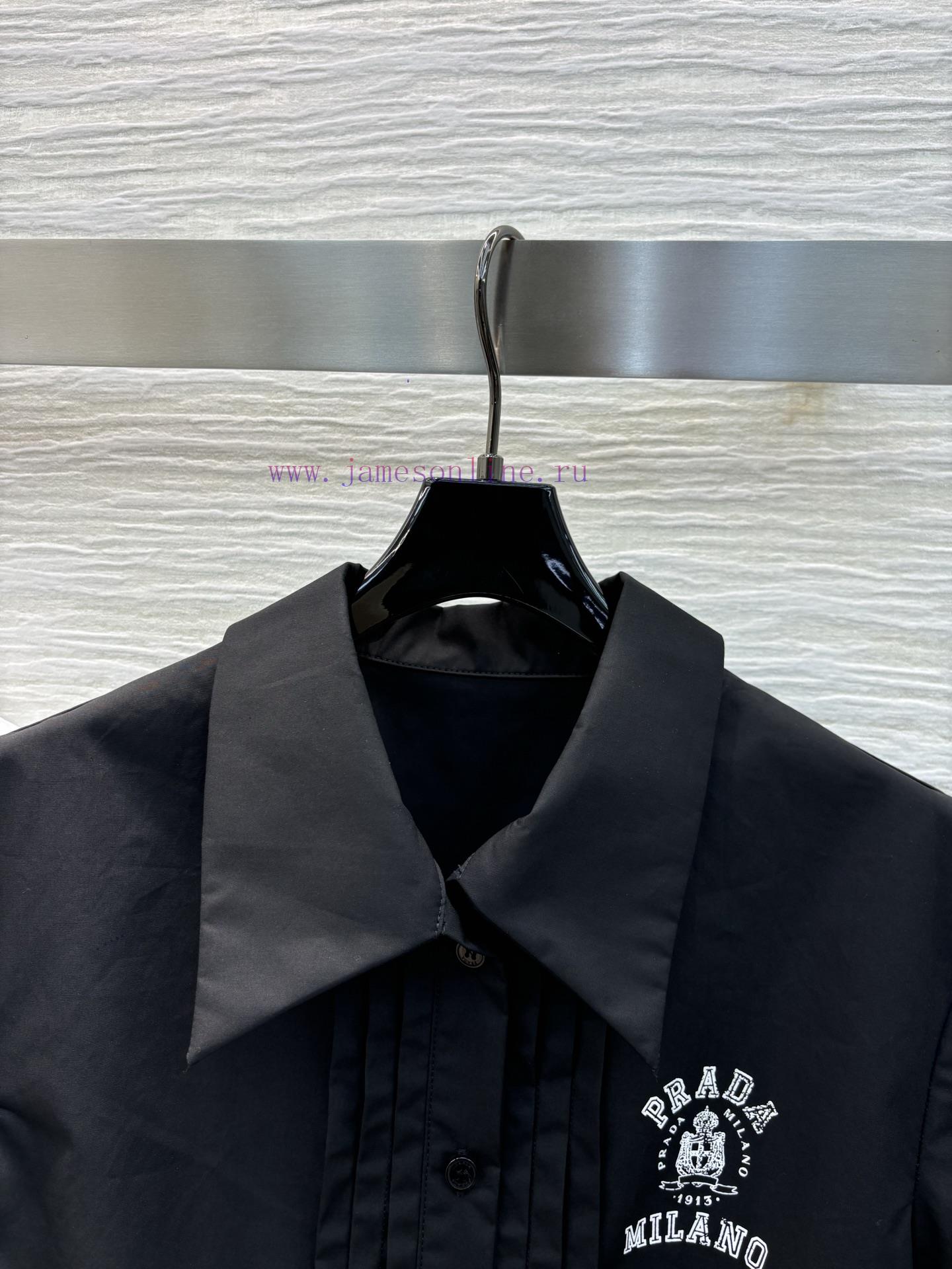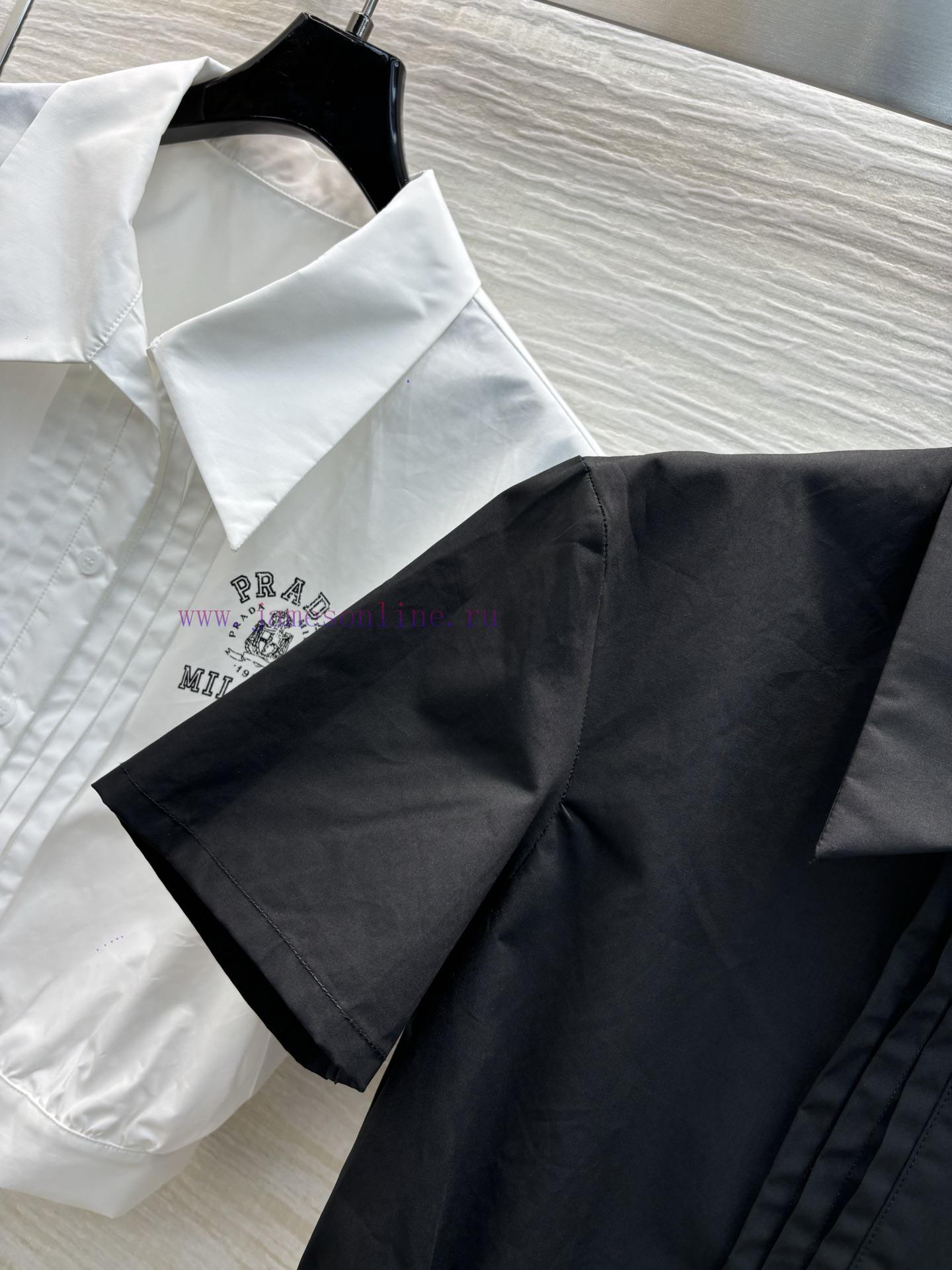 CC77558 Prada 25 Spring/Summer, logo printed pleated short shirt paired with a half skirt, a cool and super a set of small lapel designs, short cut silhouette, contrasting small letters on the chest that are both bold and spicy, all made of pure cotton fabric in one color, SML three sizes