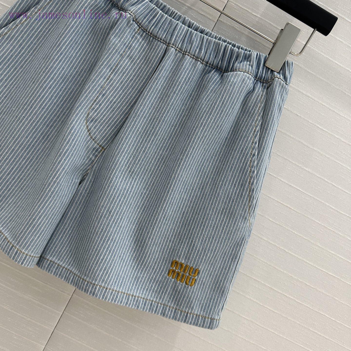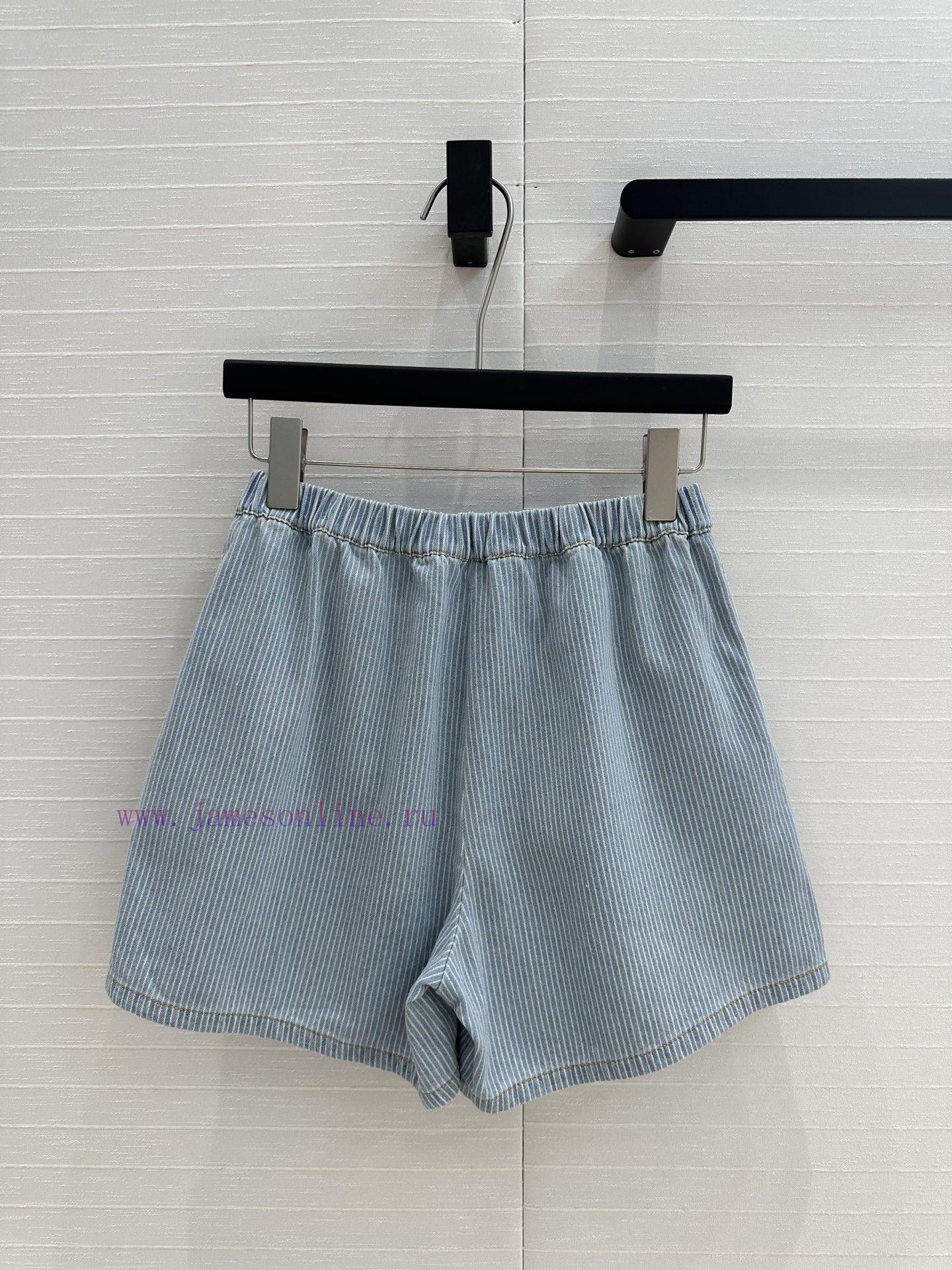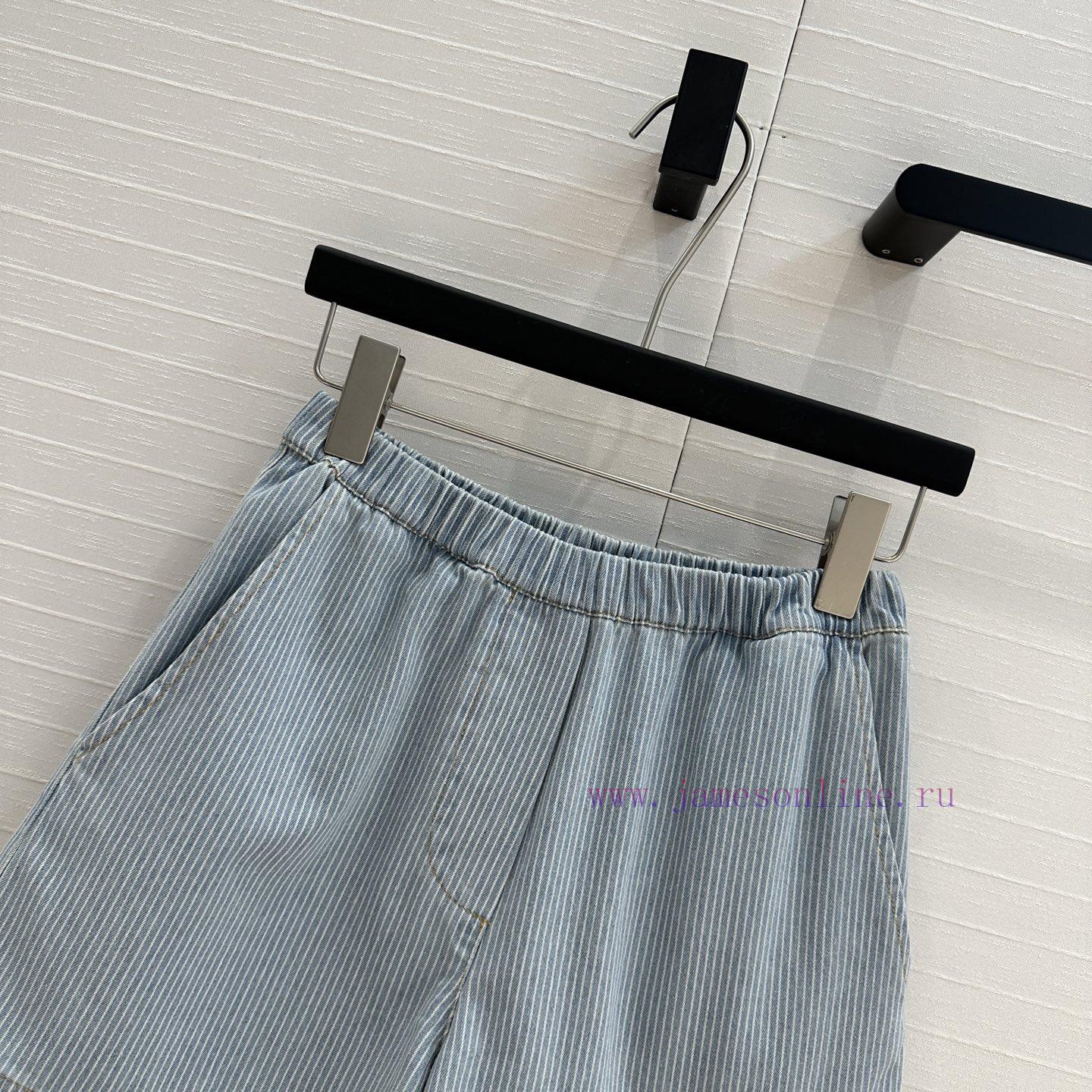 High end quality, BK77579 Miu * 25 Spring/Summer New Collection, retro striped denim shorts, elastic waist straight leg casual pants with super cool and contrasting embroidered letter logo, low-key luxury, original custom color woven striped washed denim soft and delicate texture, superb classic version, super slim upper body, versatile and not picky workmanship quality, look at details in stock, SML in three sizes, size S, waist 60, hip 92, pants length 37. Each size has a waist circumference difference of 3, hip circumference difference of 4, and pants length difference of 1. Update Time: April 15, 2025 by TaoChL