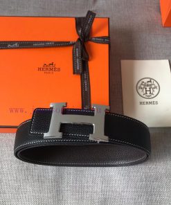 P Hermes Men’s BoutiquePure steel dual color original belt buckle&lychee pattern double-sided top layer cowhide belt, double-sided white color stitching design, highlighting unique styleWidth 38 millimeters