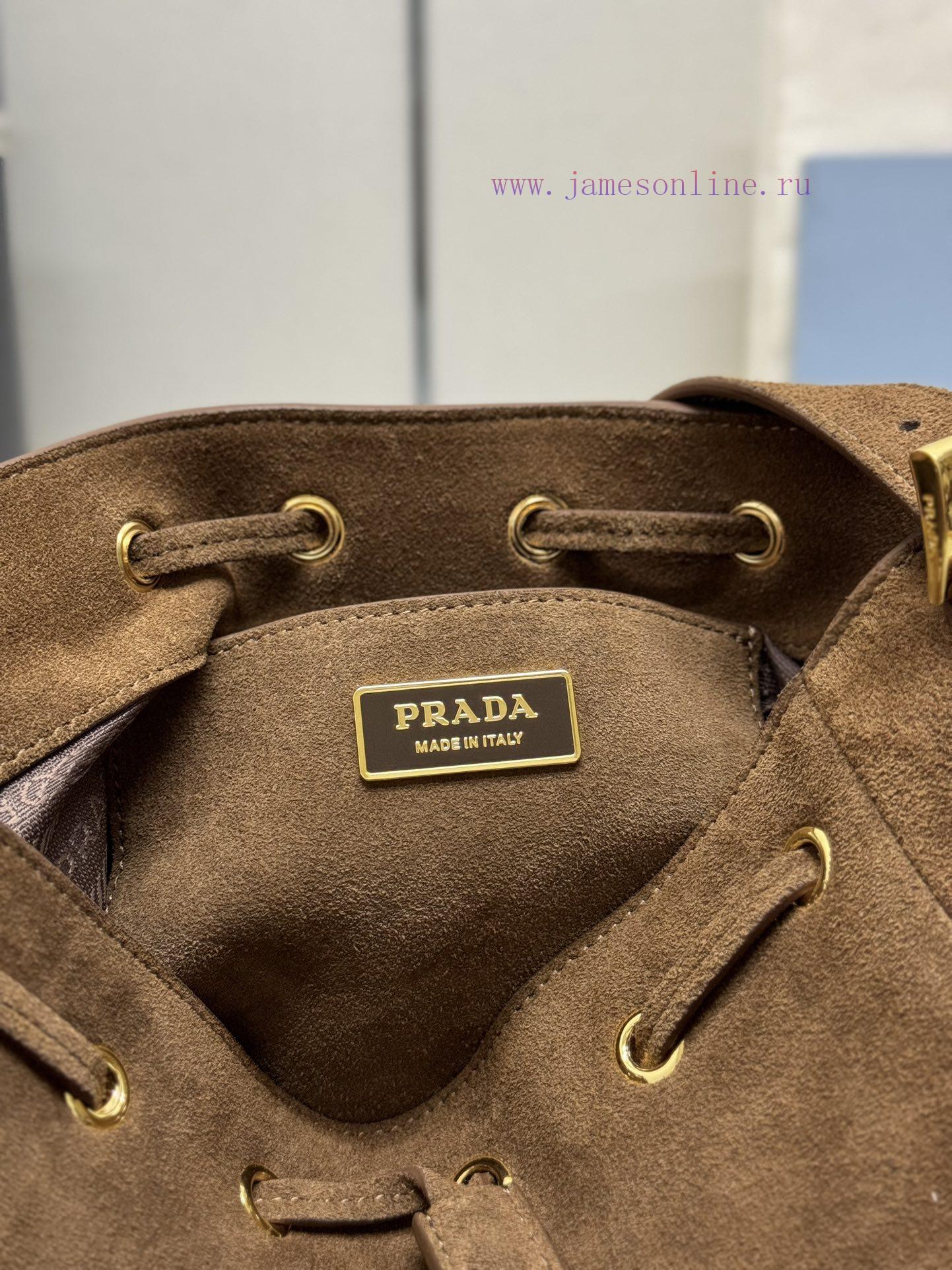 The new frosted leather bucket bag 1BE079 suede has arrived, with a detachable and adjustable leather handle made of suede calf leather material and a metal engraved logo. The top of the suede fringe is decorated with a leather drawstring, and there is a leather pocket inside with a goddess door. Hurry up and get it, model 1BE079, size 21 × 21 × 12cm