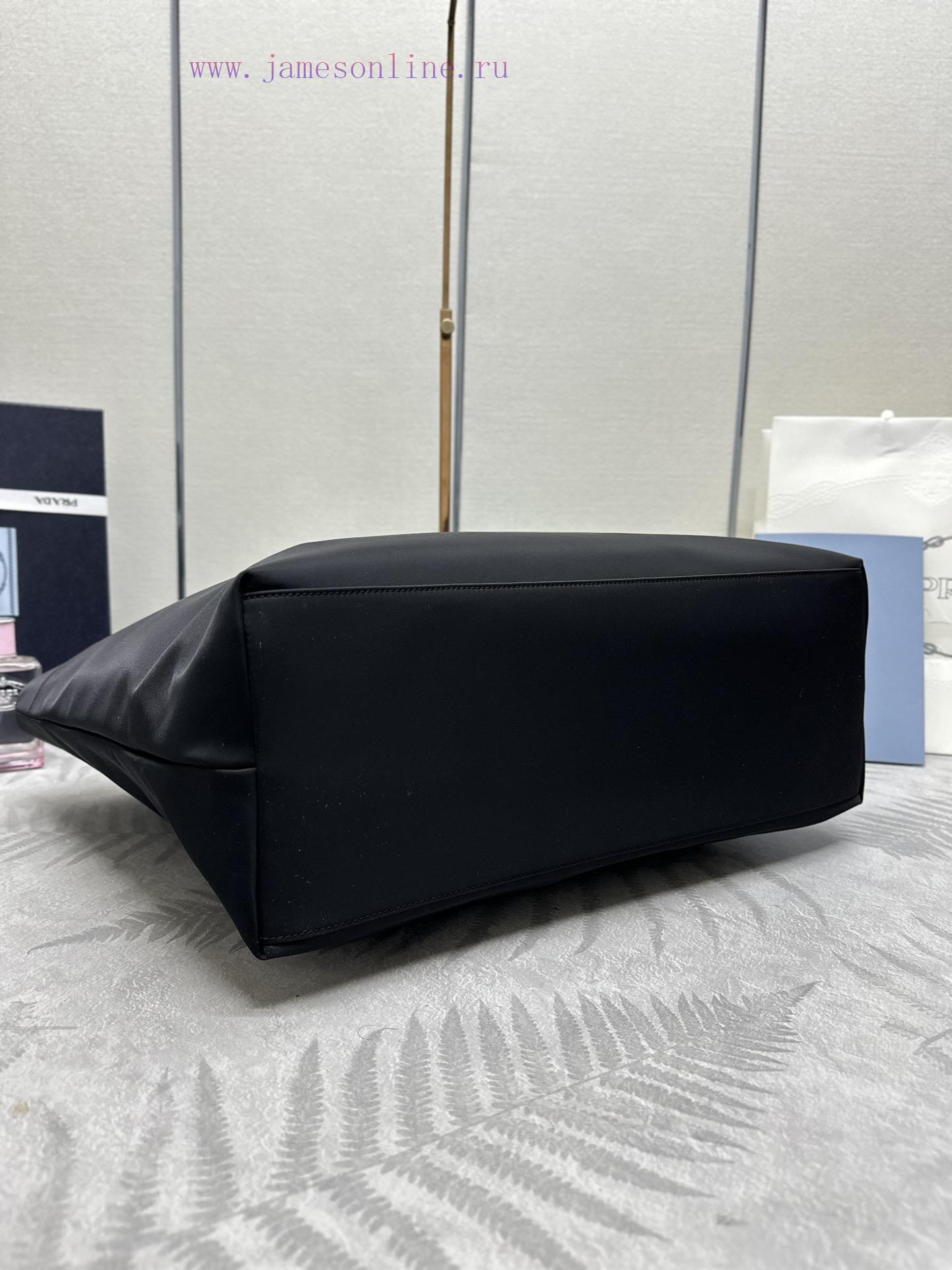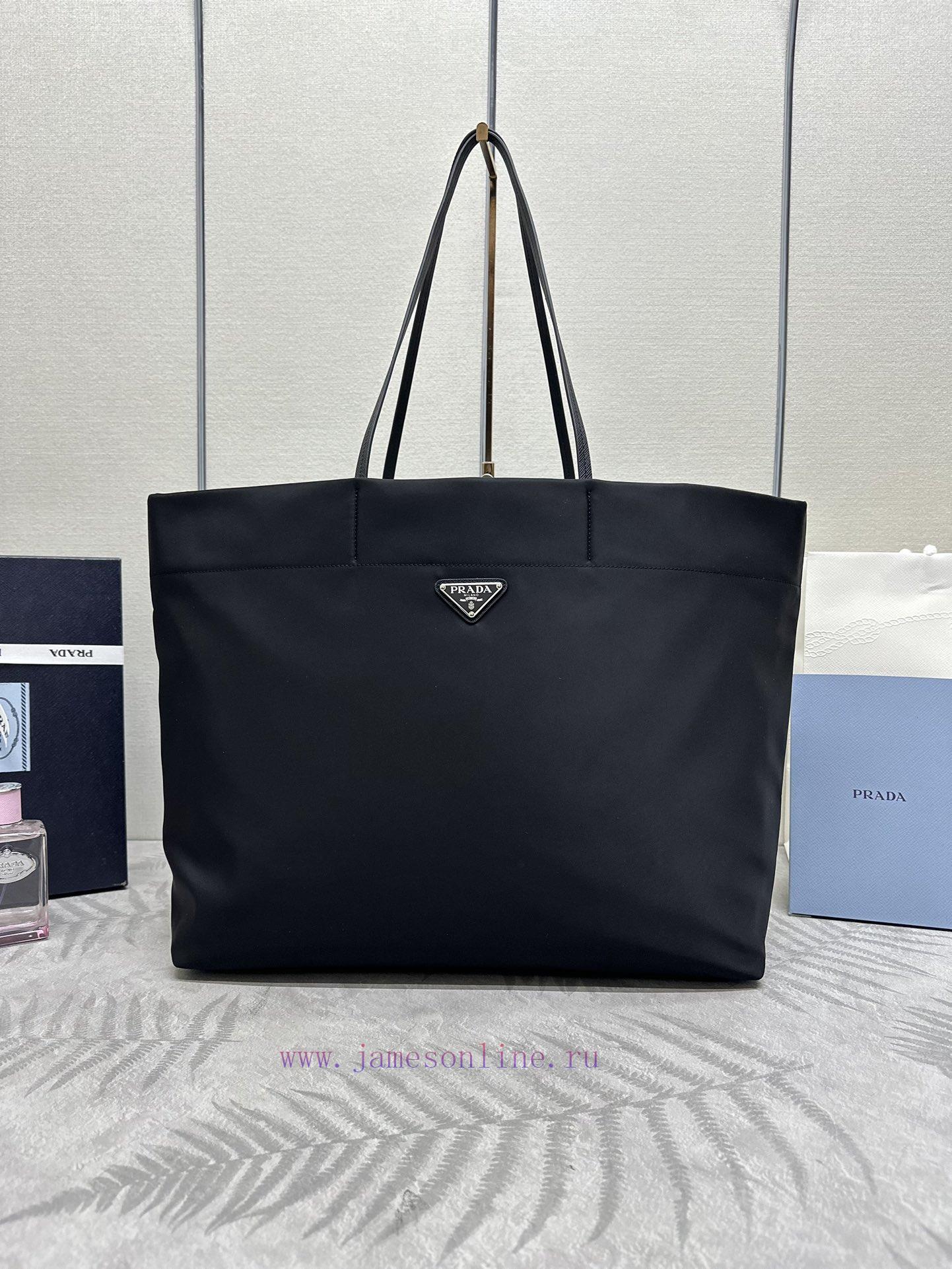 The new shopping bag 1BG107 is a medium-sized tote bag made of innovative recycled nylon fabric, with a simple and stylish design. The bag body is equipped with exquisite Saffiano leather handles, adorned with the iconic enamel coated triangular metal logo, conveying the brand message. The large space capacity is very practical, fashionable and simple, and it is also a timeless shopping bag. If you like babies, hurry up and buy it nowDimensions: 40cm in length, 34cm in height, and 16cm in base (this item is too large and does not come with packaging)
