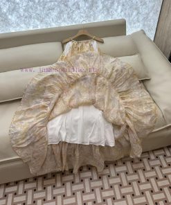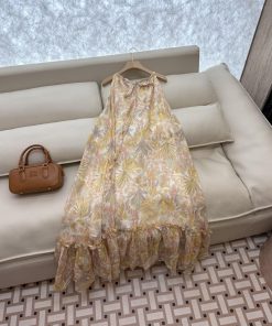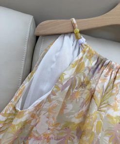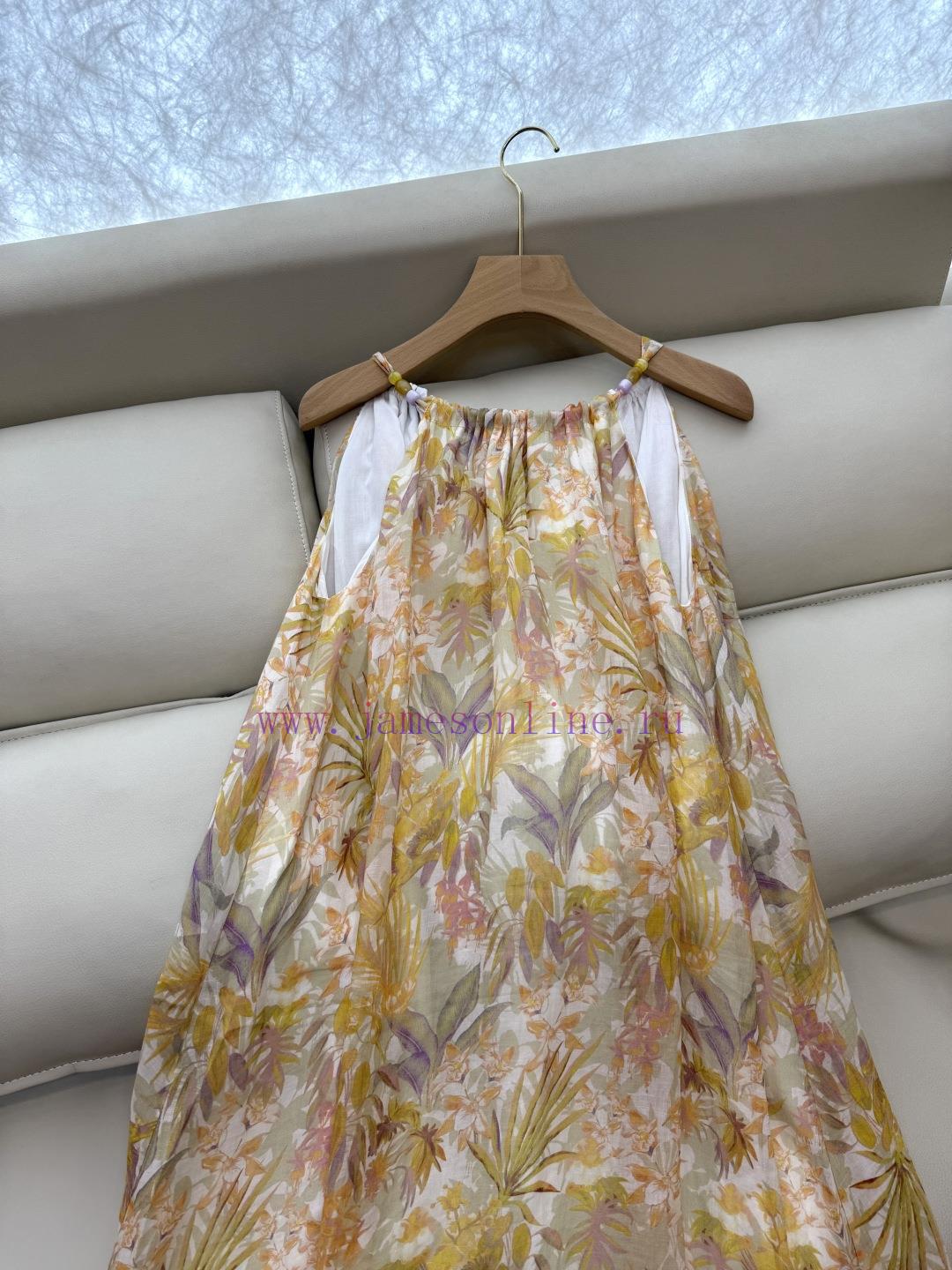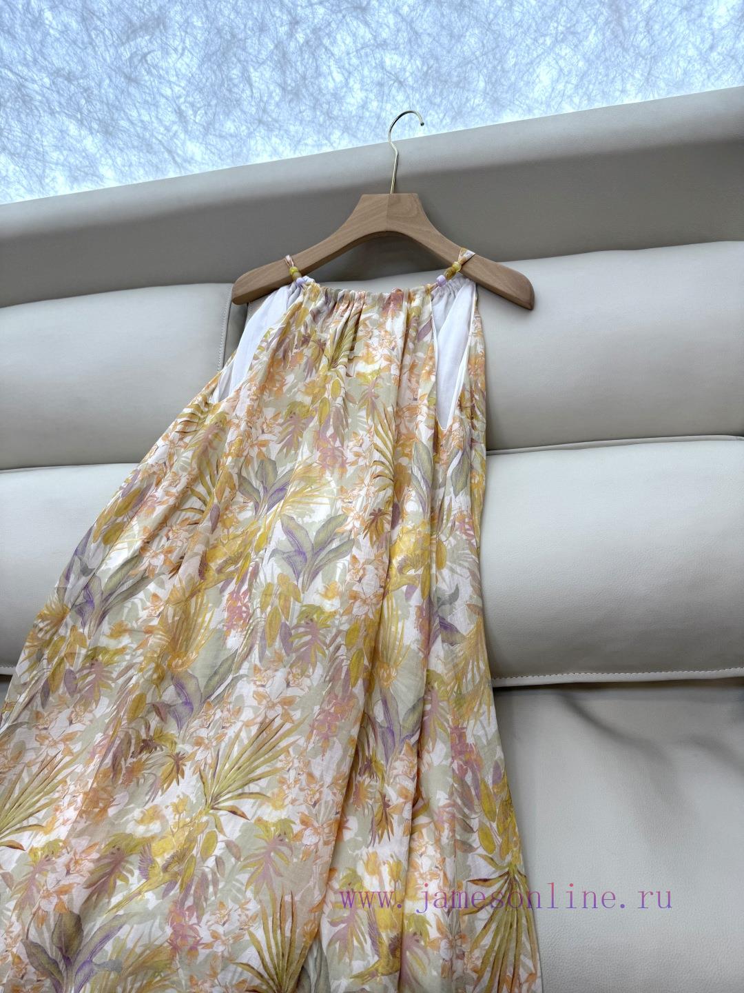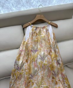 YZY031 100% Linen Printed Loose Strap Holiday Style Linen Dress Yellow SMLXL